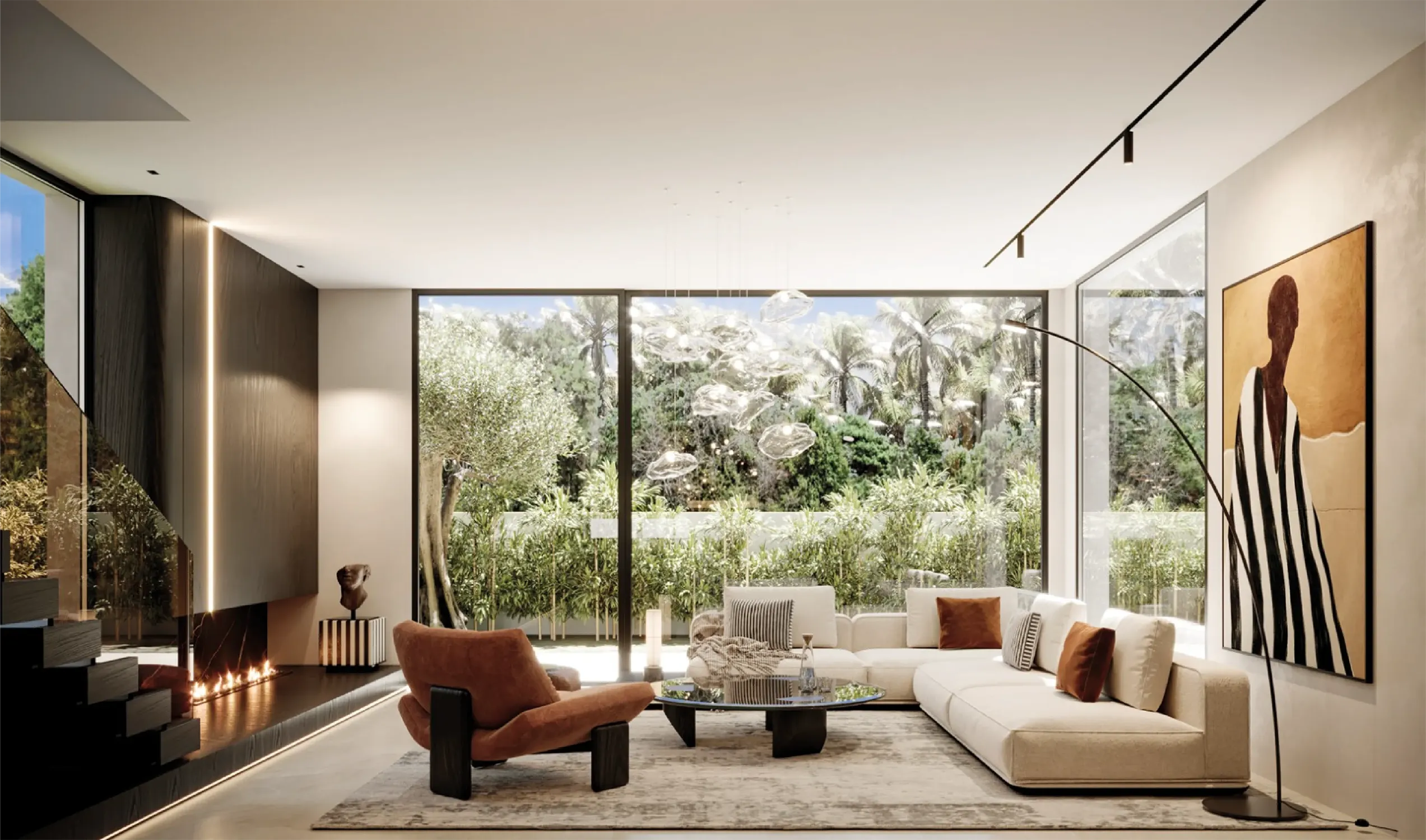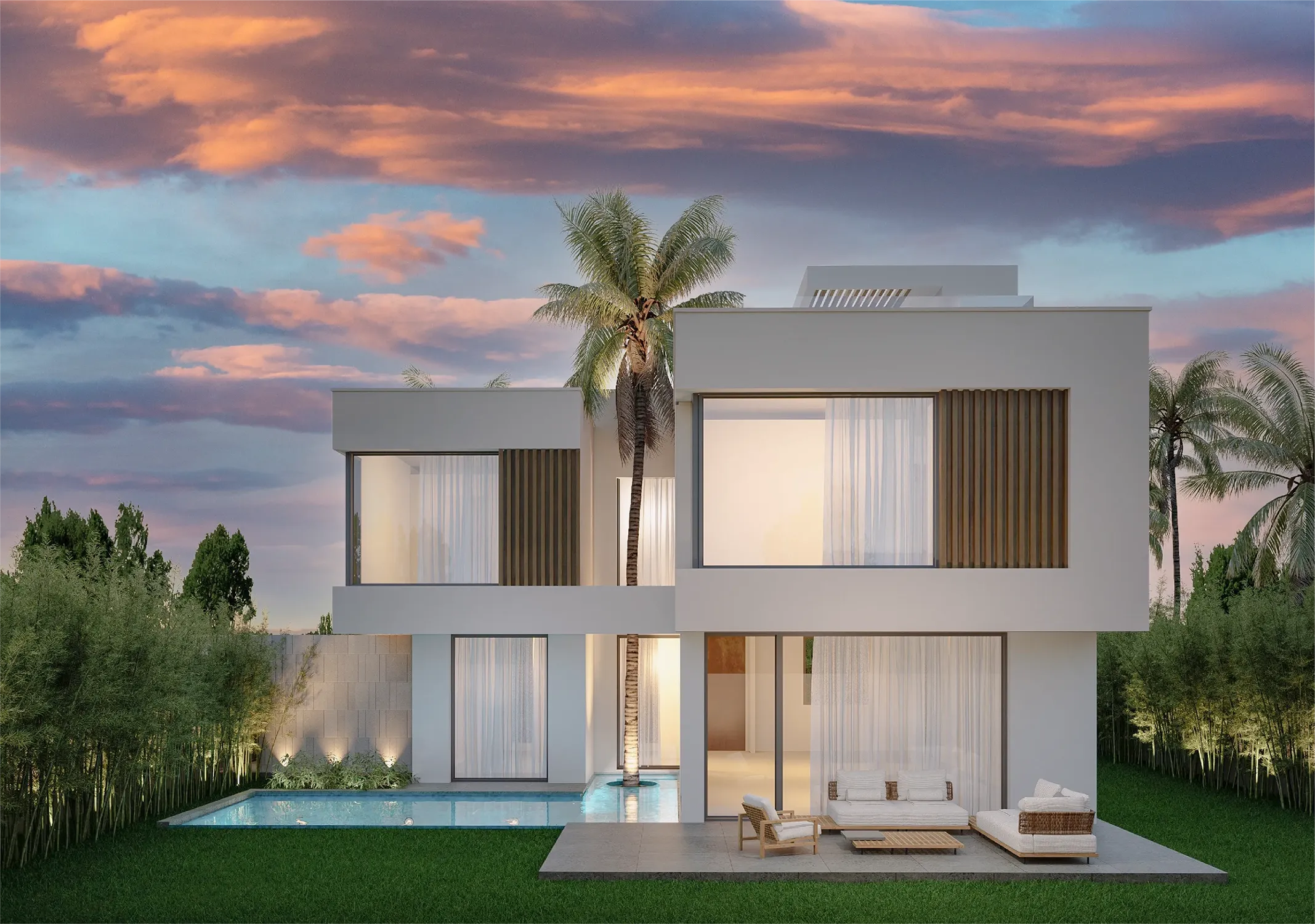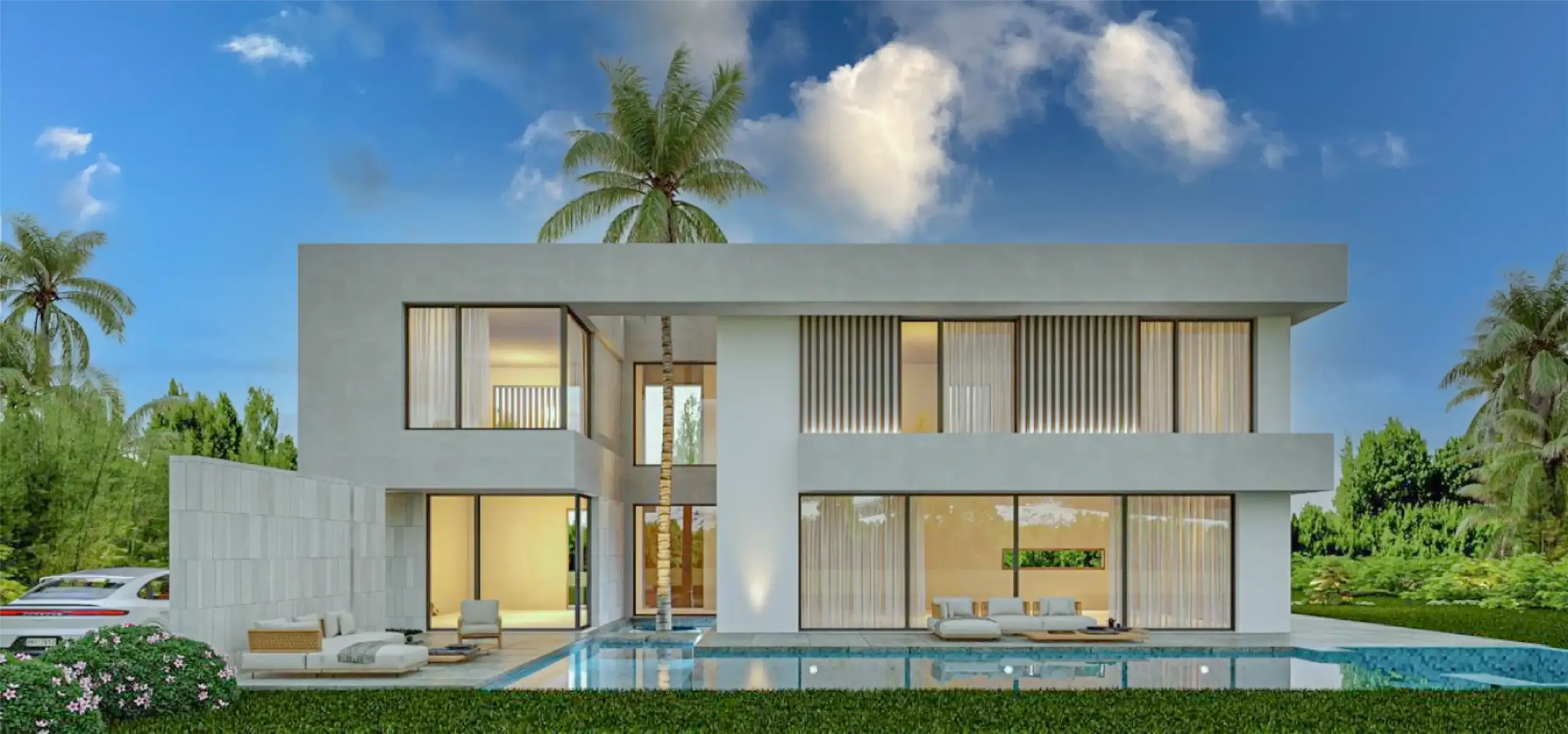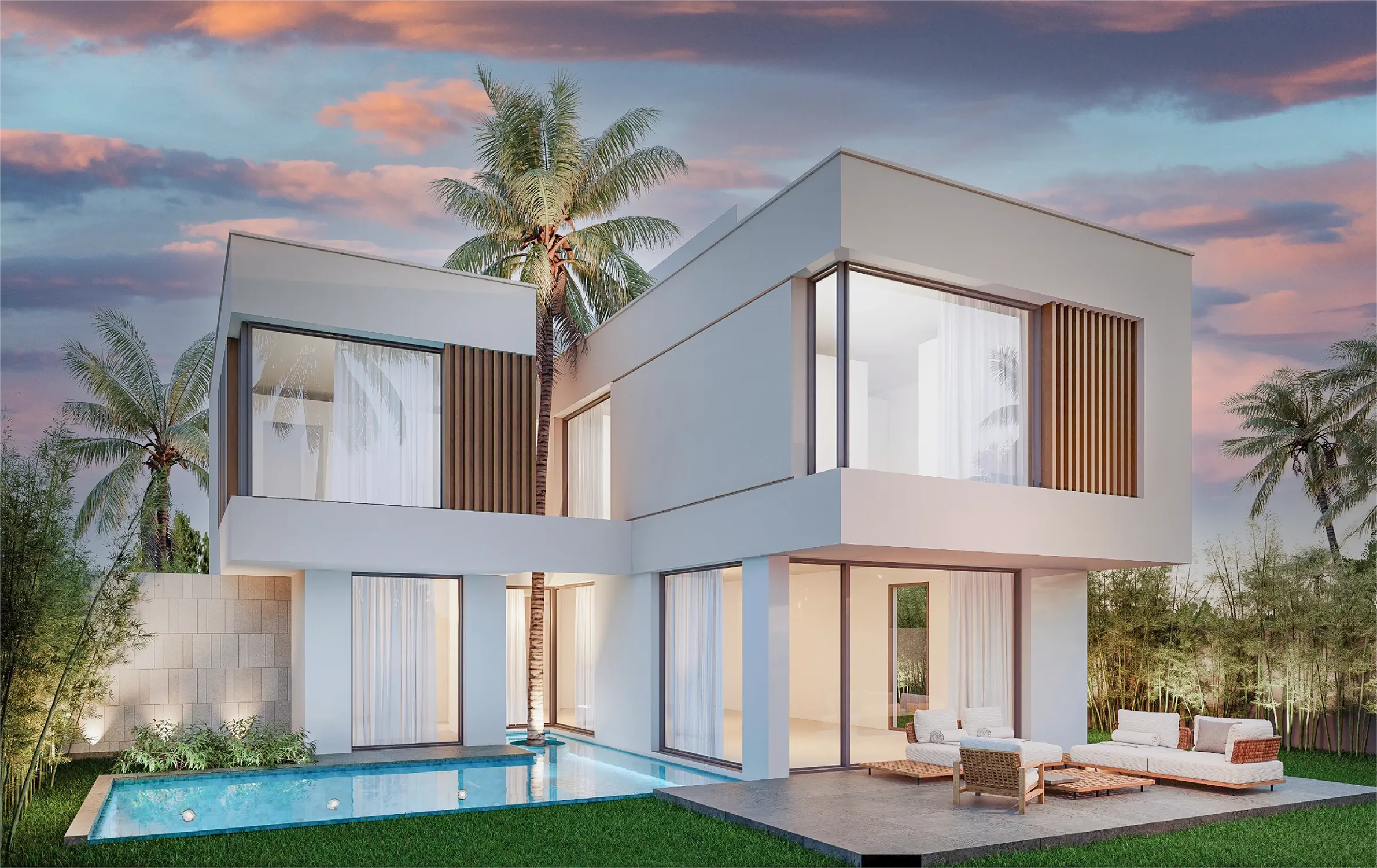 • Extérieur : Piscines prévues, jardins paysagers, belles ouvertures et baies vitrées toute hauteur.