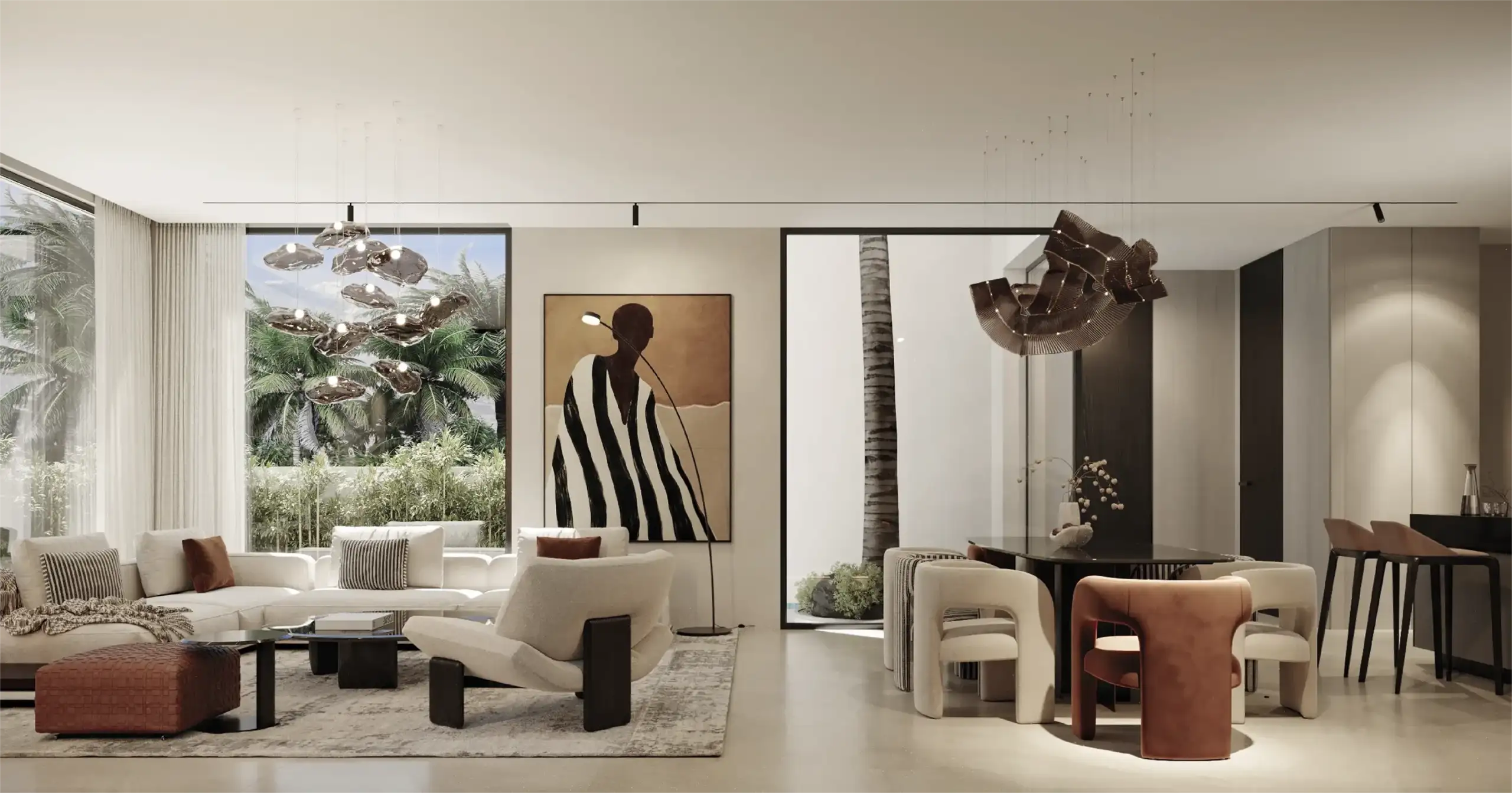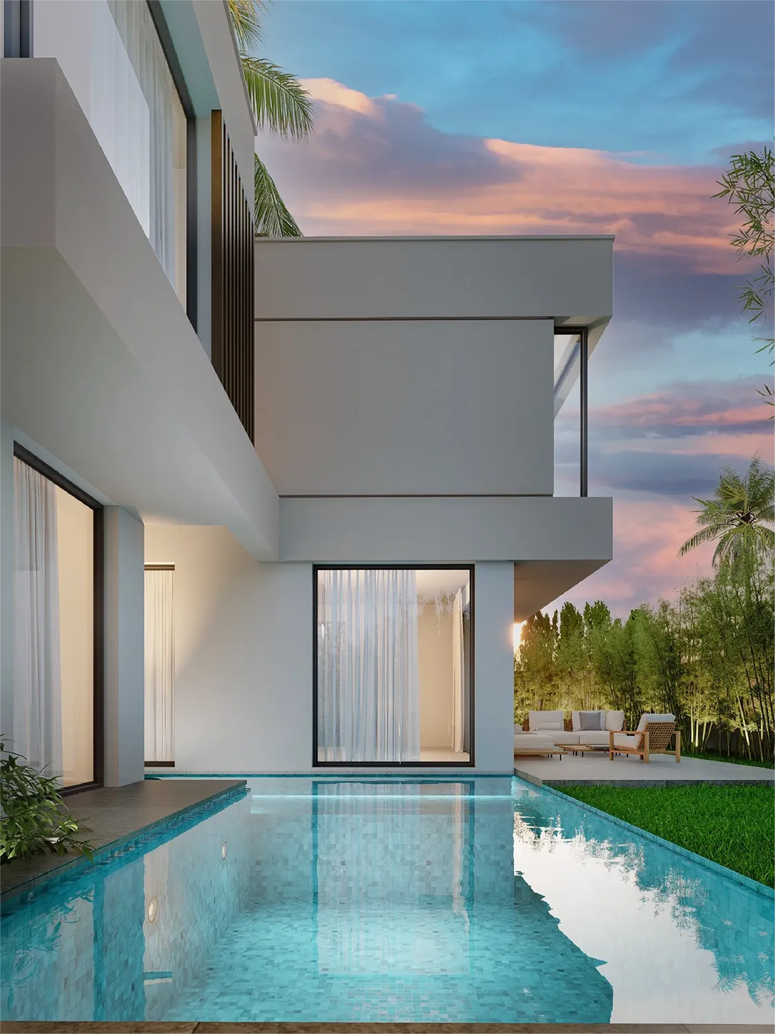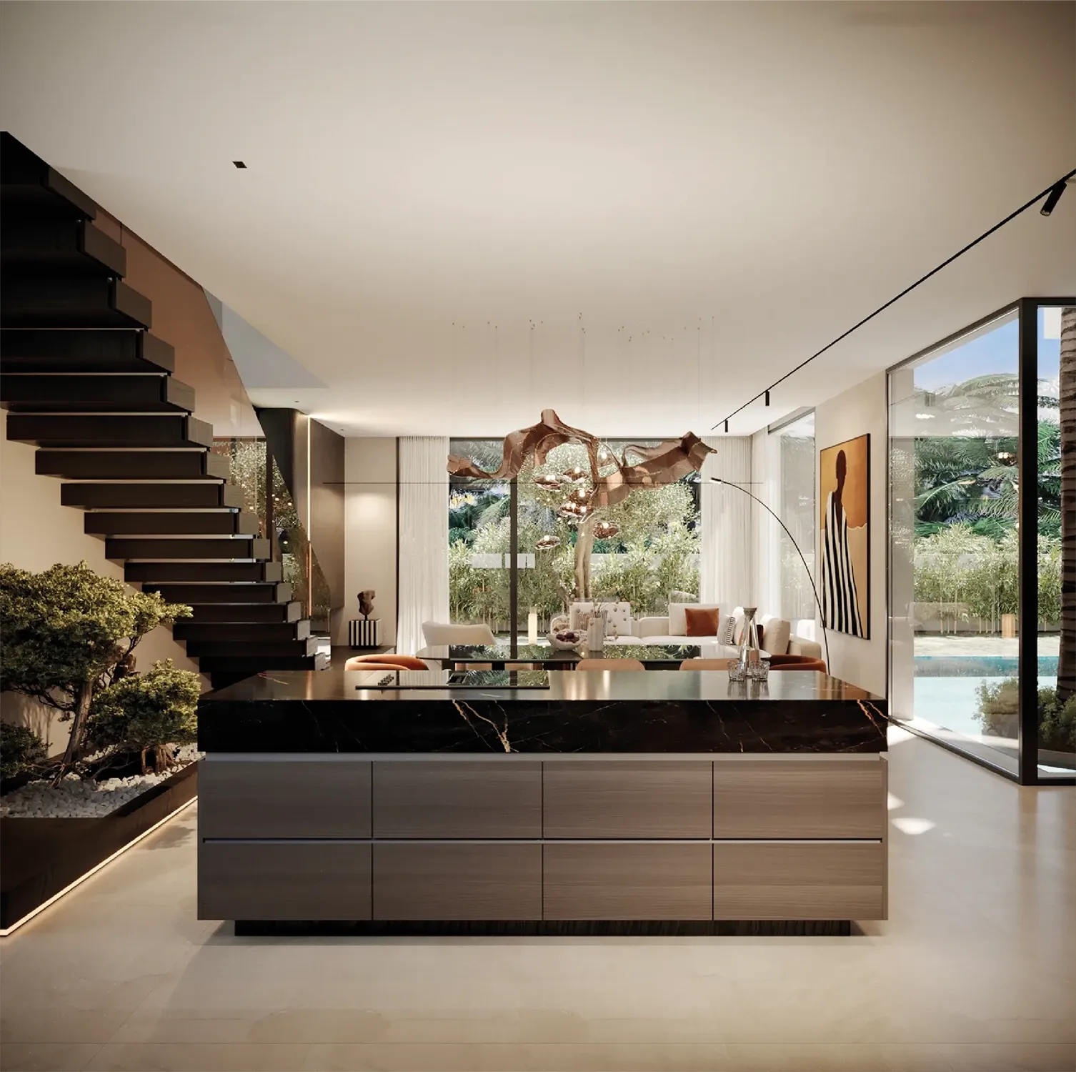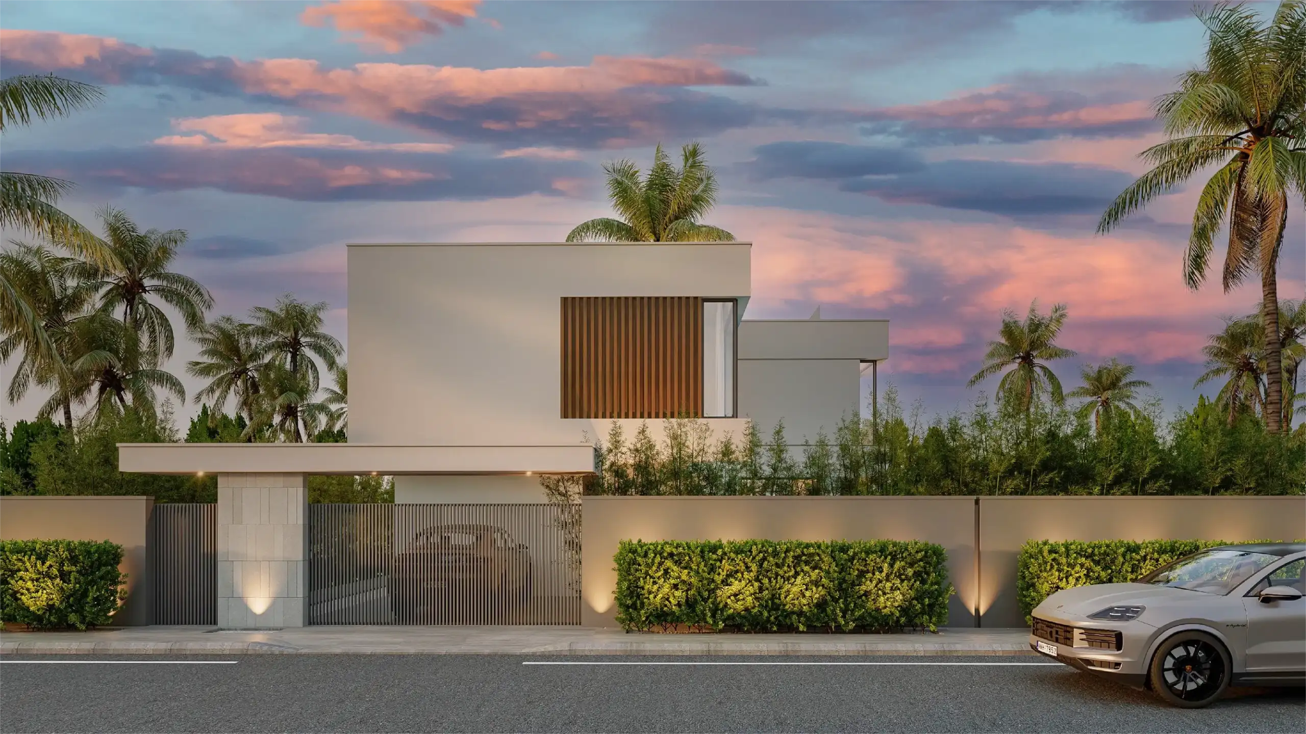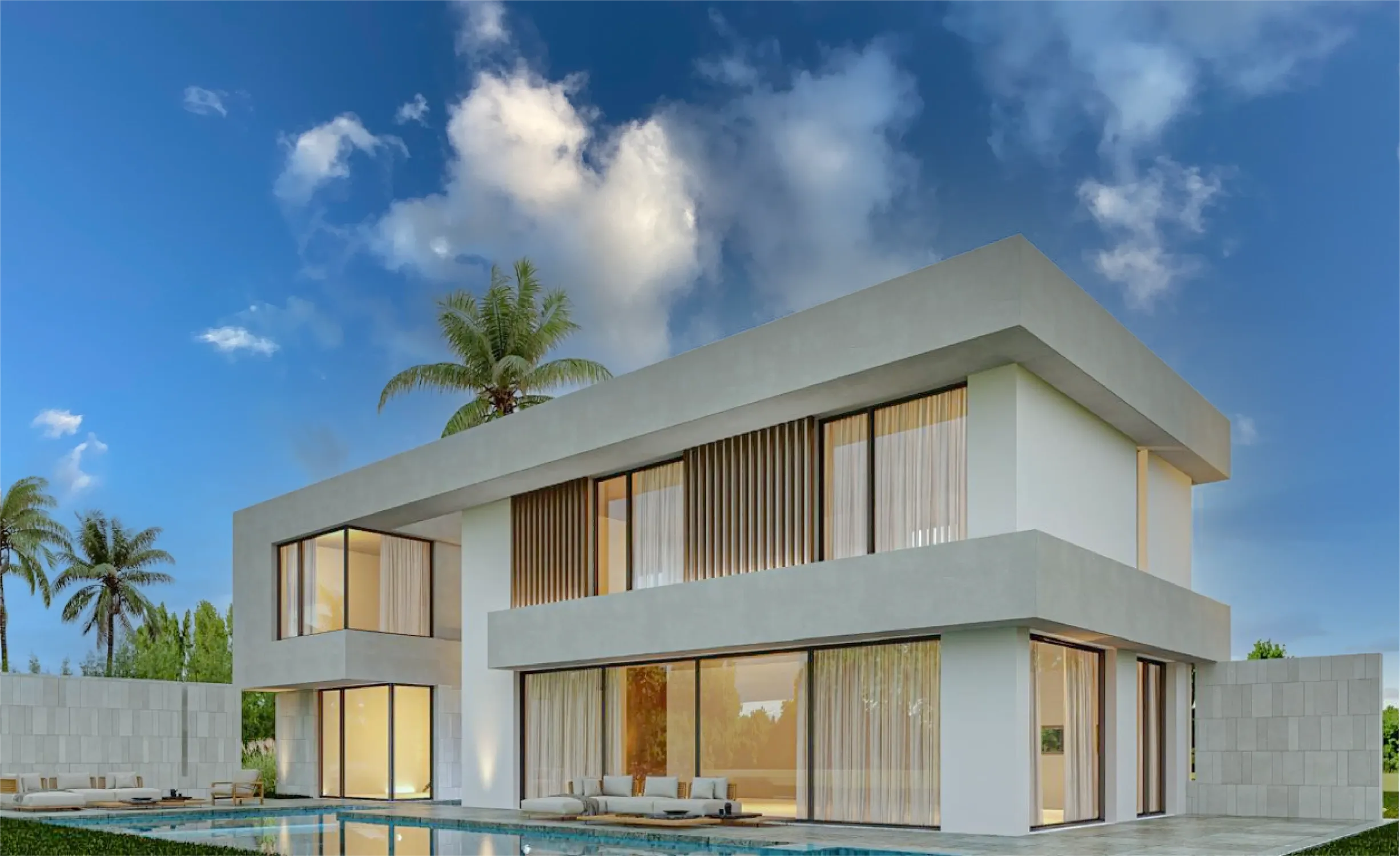 • Extérieur : Piscines prévues, jardins paysagers, belles ouvertures et baies vitrées toute hauteur.