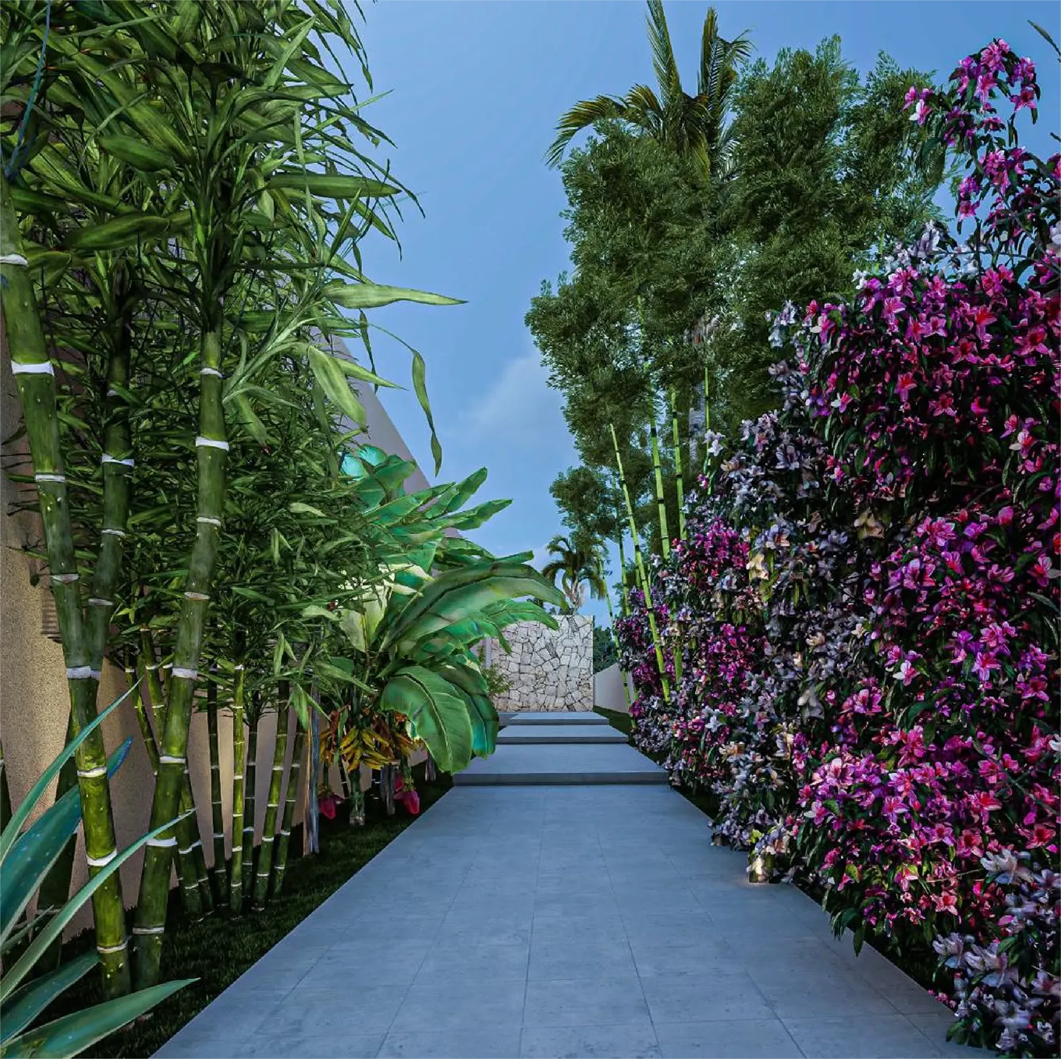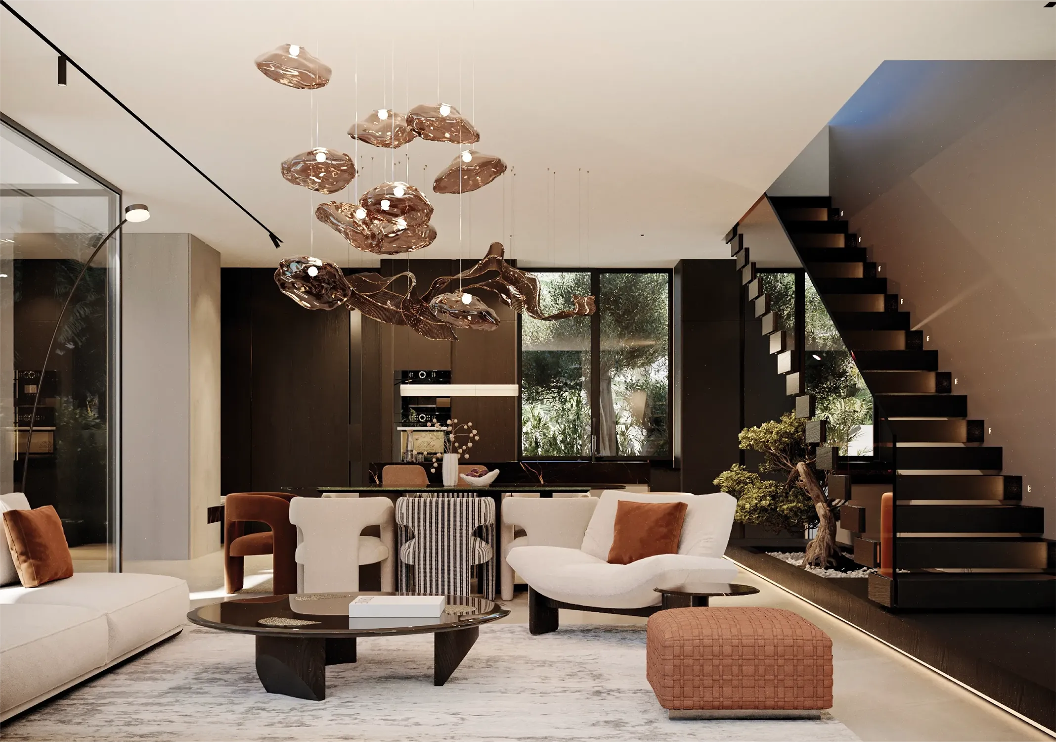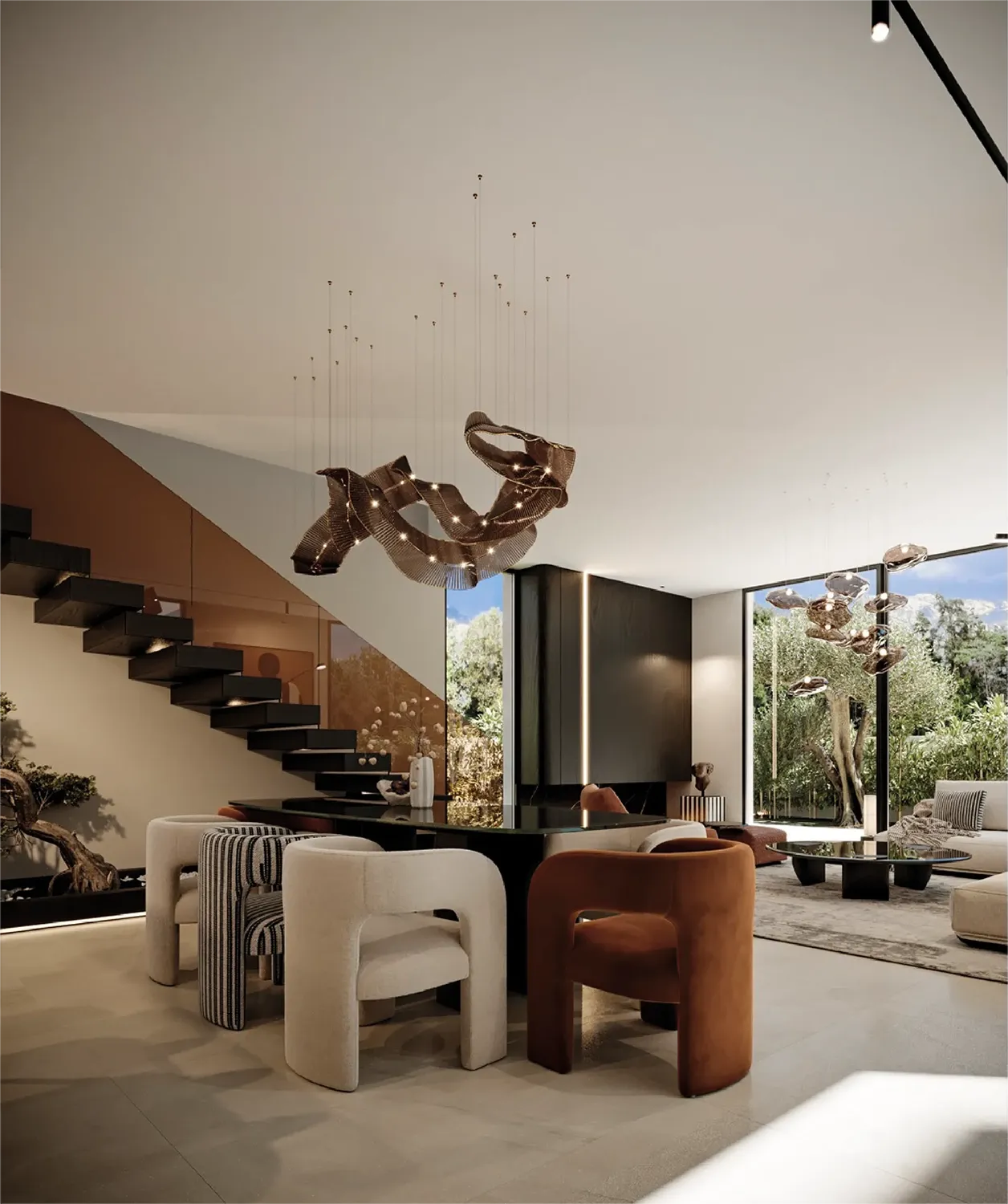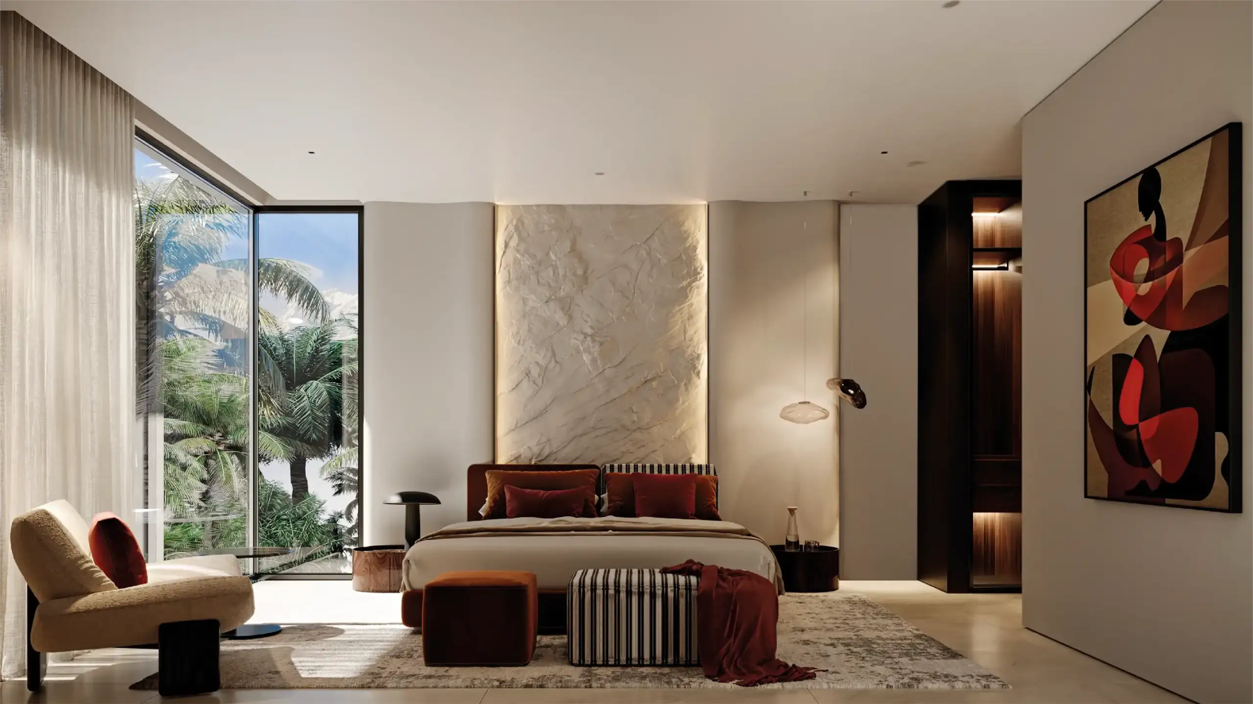 • Extérieur : Piscines prévues, jardins paysagers, belles ouvertures et baies vitrées toute hauteur.