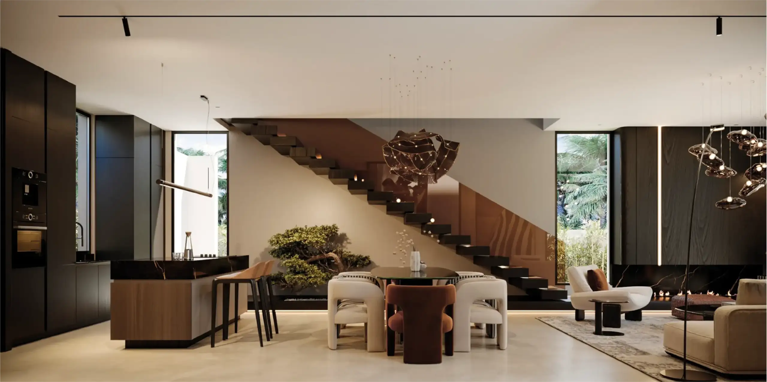 • Intérieur : Villas modernes avec agencement optimisé, terrasses au rez-de-chaussée, suites spacieuses, cuisines équipées, et sanitaires haut de gamme.