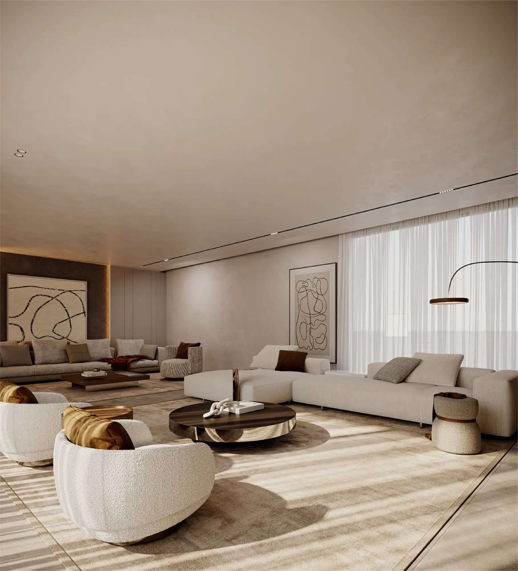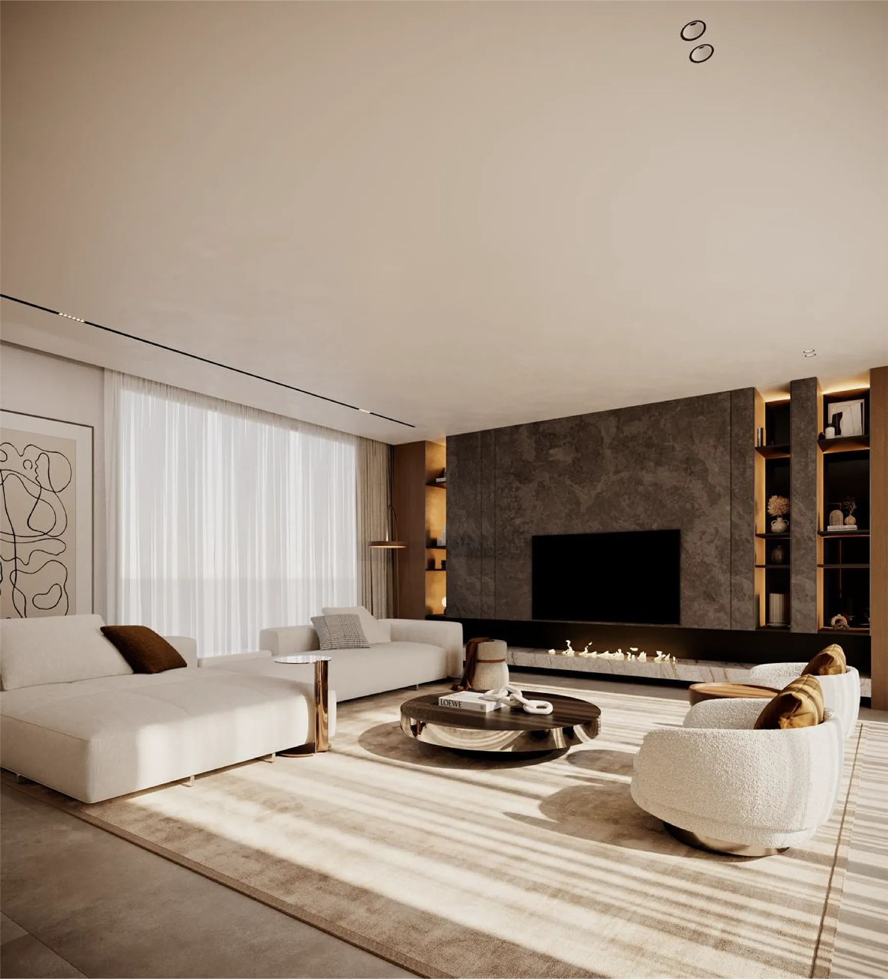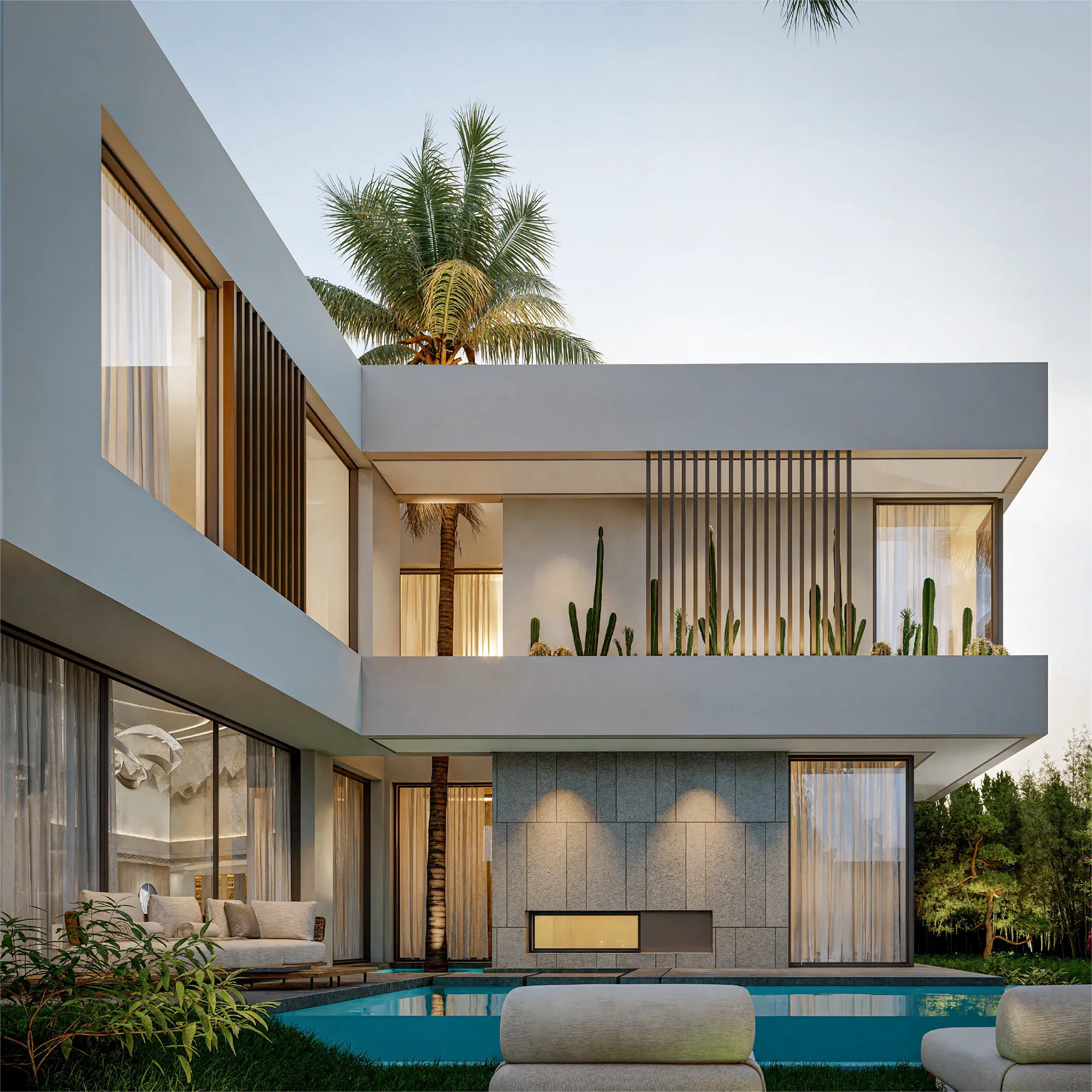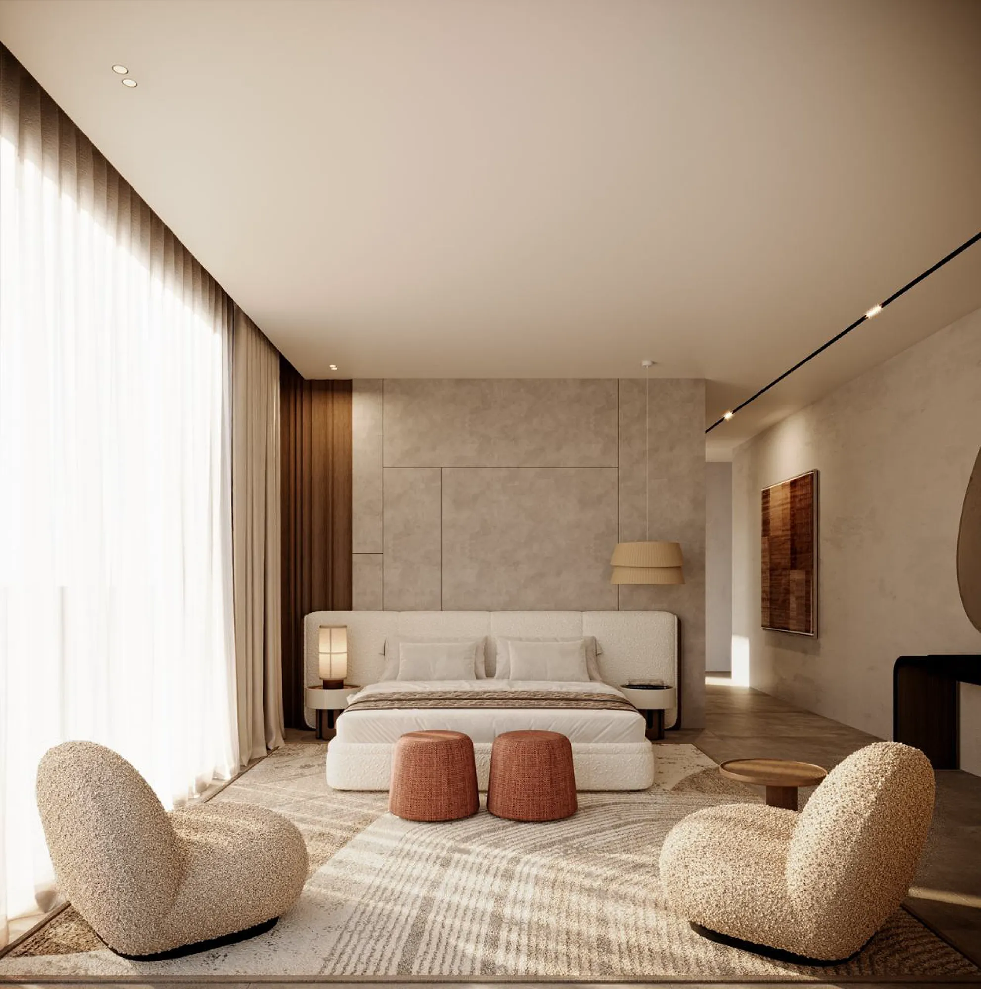 - Finitions : Sols et terrasses en carreaux 100×100 ou marbre, SDB en 60×120 ou marbre, plafonds blancs, faux-plafonds staff avec intégration CVC & éclairage.