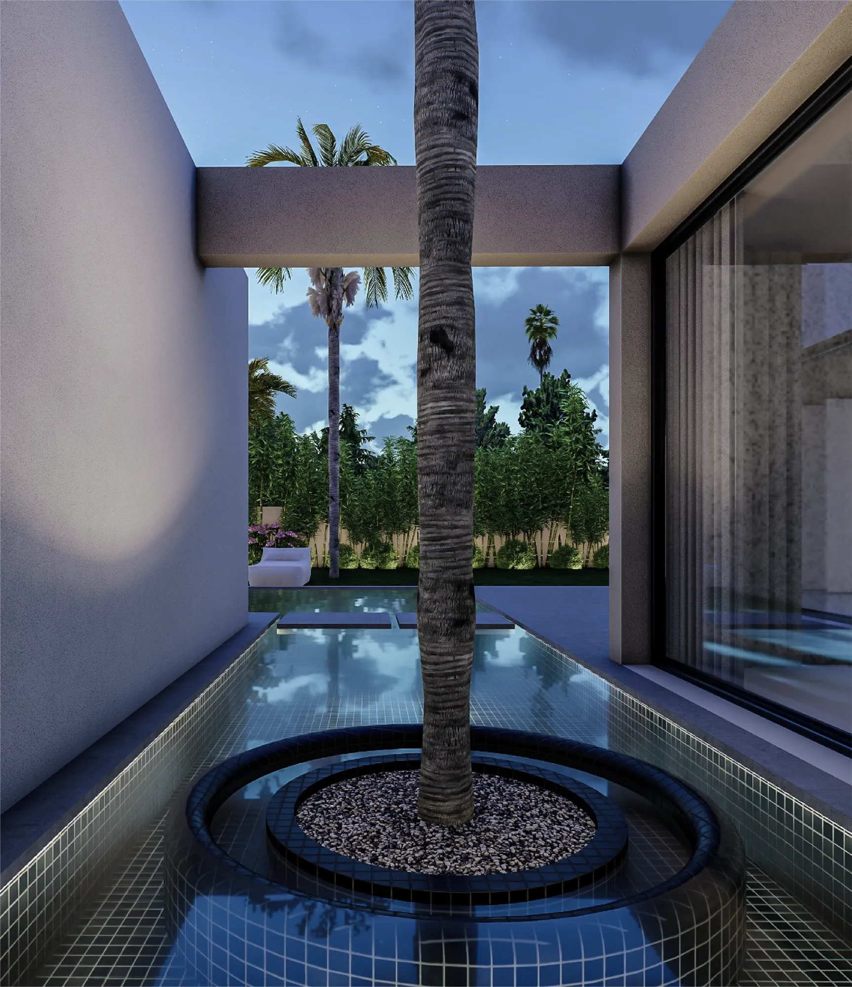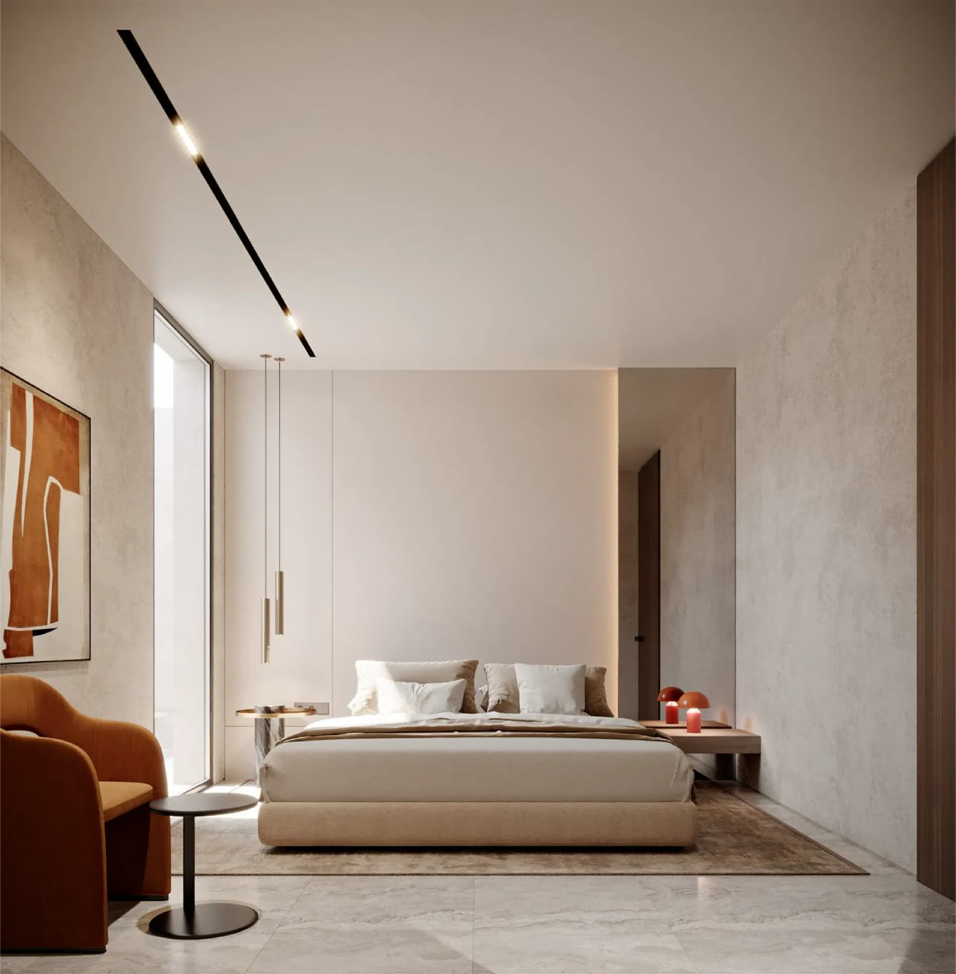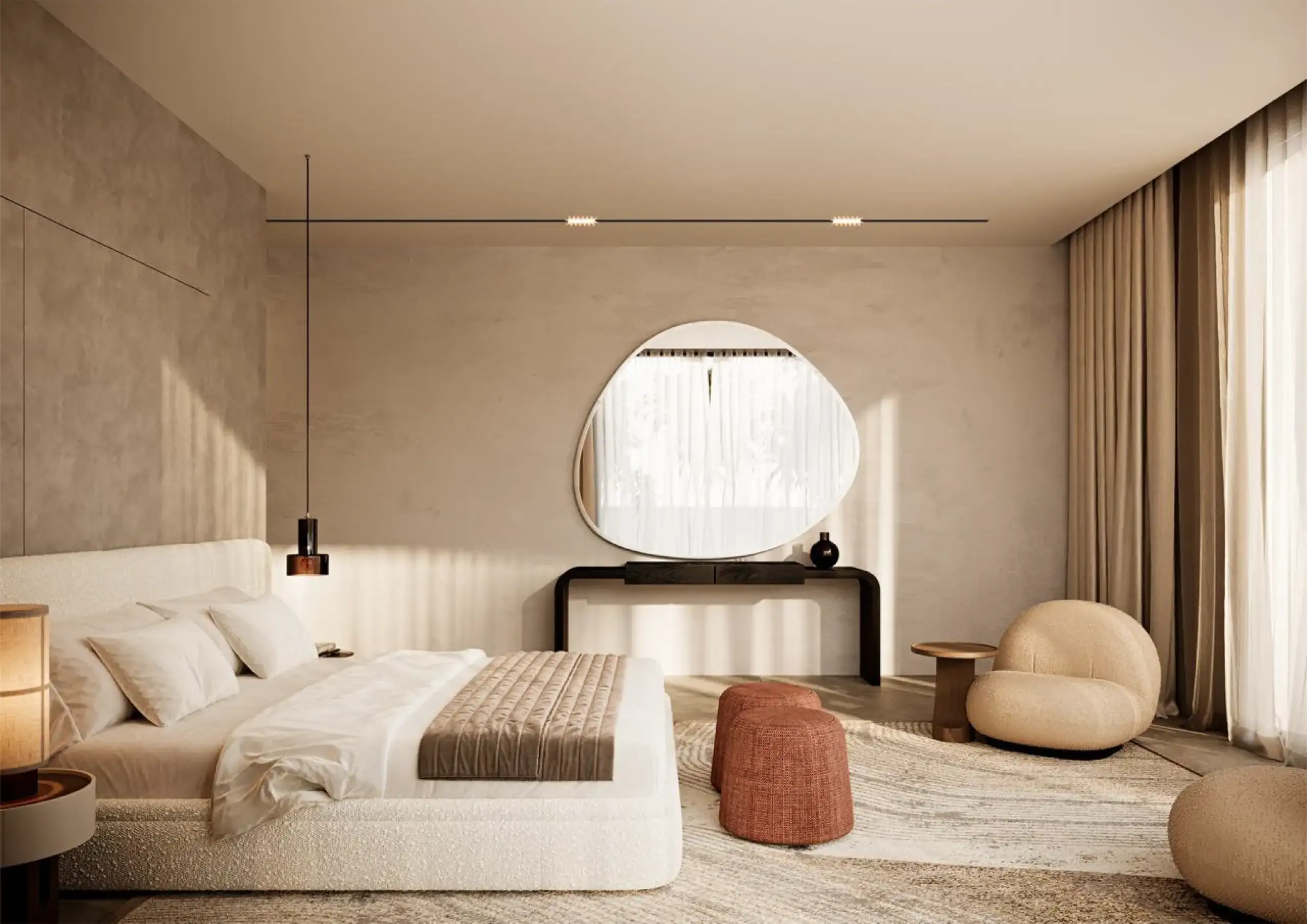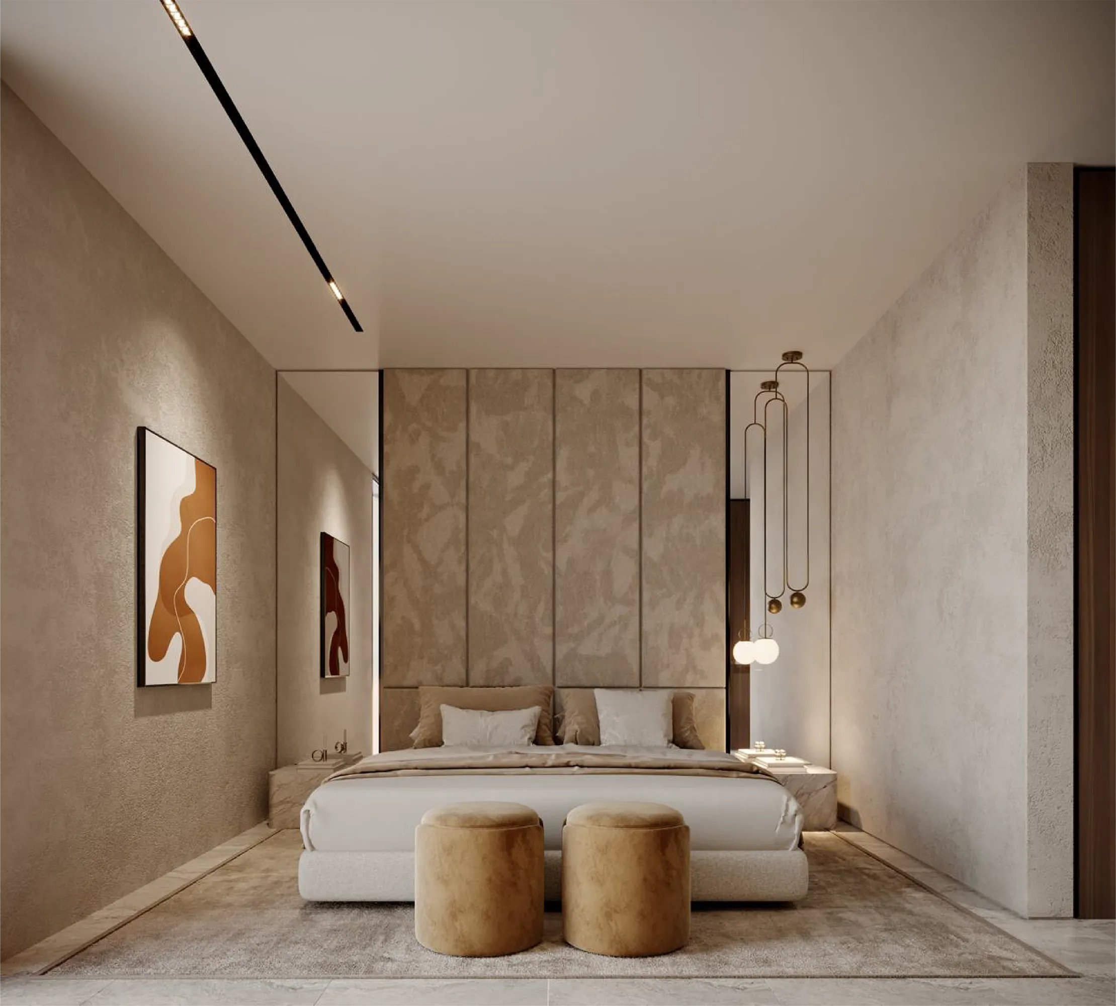 - Finitions : Sols et terrasses en carreaux 100×100 ou marbre, SDB en 60×120 ou marbre, plafonds blancs, faux-plafonds staff avec intégration CVC & éclairage.
